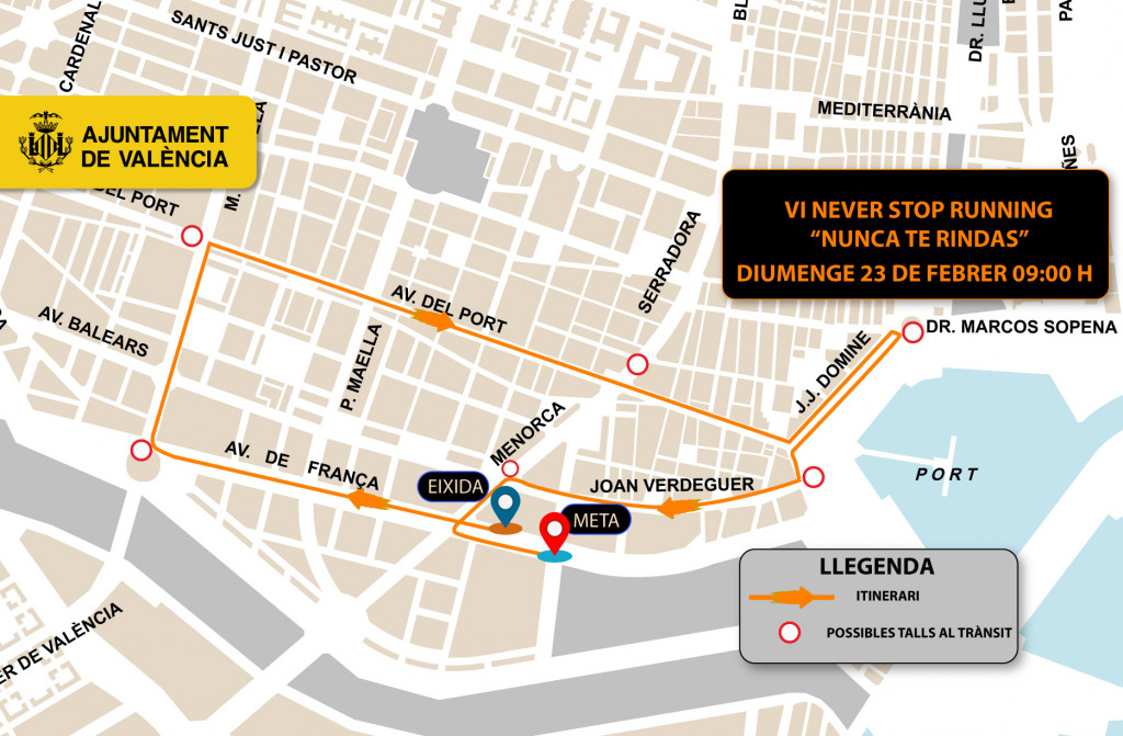 Por lo que respecta a la carrera ‘Never Stop Running’, que el próximo domingo 23 de febrero celebrará su sexto aniversario y que forma parte del Circuito de Carreras Populares de la ciudad de València, está programada de 09:00 horas a 10:20 horas, tanto la modalidad de carrera como la de marcha. El itinerario a seguir de la prueba de 5 kilómetros por parte de los y las participantes es el siguiente: avinguda de França, plaça d’Europa, carrer del Pare Tomàs de Montañana, avinguda del Port, vía de servicio del carrer del Doctor Josep Juan Dòmine, giro a la altura del carrer de Francesc Cubells para volver por la misma calle pero por calzada hasta l’avinguda de l’Enginyer Manuel, carrer de Joan Verdeguer, avinguda de les Balears, carrer de Menorca y avinguda de França de nuevo.