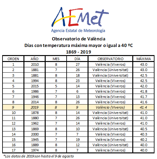 La temperatura alcanzada hoy es la novena más alta en la ciudad de la serie histórica desde que se tienen datos. El 26 de agosto de 2014 se llegó a los 41.6 grados y, quizá el dato más curioso, en 2015 se marcó el quinto registro más elevado de la historia en València, 42 grados. Lo llamativo es que, a diferencia de todos los demás registros de más de 40 grados, este tuvo lugar en el mes de mayo y no en julio o agosto.