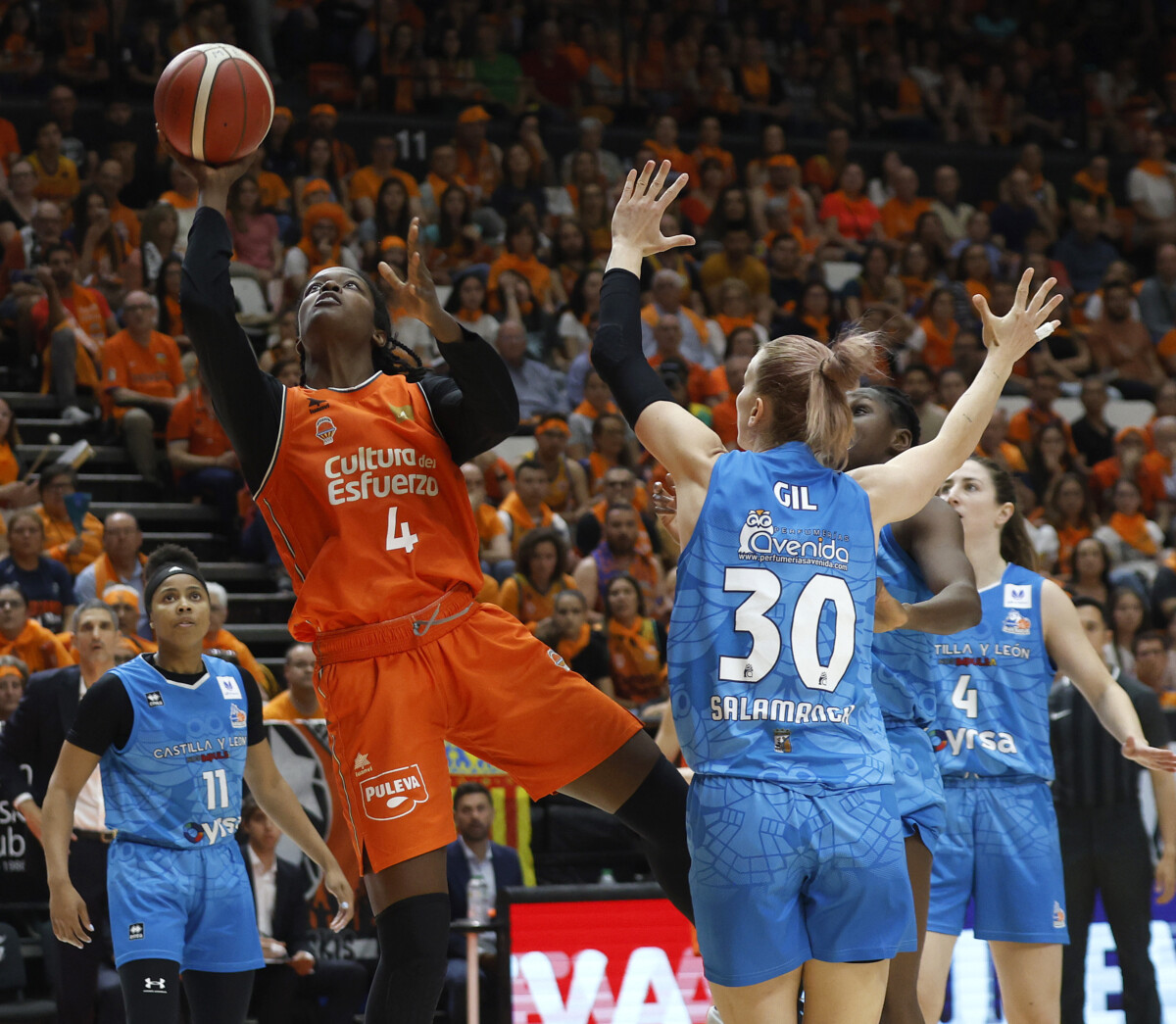 La defensa taronja, implacable, apenas dejaba huecos, y la presión constante causaba numerosas pérdidas de balón en el equipo salmantino. Cristina Ouviña entrando desde el banquillo, mantenía la intensidad defensiva y contribuía con puntos clave que elevaban la ventaja a dobles dígitos antes del descanso.