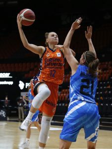 Las visitantes seguían compensando con triples la mejoría taronja, y el marcador seguía igualado en el inicio del segundo.