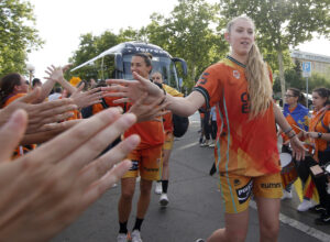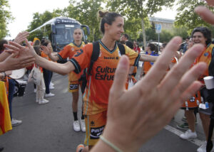 Queralt Casas como capitana salió al centro de la cancha a recibir de las manos de Elisa Aguilar y Raquel Tamarit, consellera de educación, cultura y deportes de la GVA el trofeo por el que tanto han luchado.