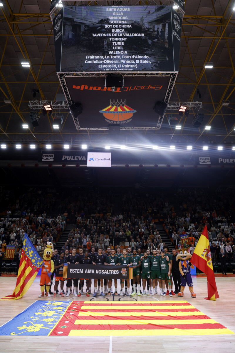 En un ambiente más solemne de lo habitual, con menos música y megafonía moderada, los jugadores de Valencia Basket salieron a calentar con camisetas que llevaban el lema 'Estem amb vosaltres' (Estamos con vosotros) y un lazo naranja.