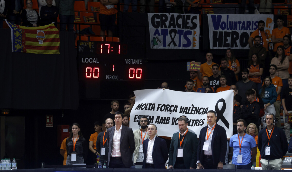 El Valencia Basket y la Fonteta se unieron este martes durante el partido entre el equipo 'taronja' y el Cedevita Olimpia Liubliana para rendir homenaje a las víctimas de la DANA
