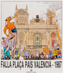 En València, el fuego nos une en torno a la construcción efímera de cosas nuevas; de lo insólito y lo sorprendente. Construimos las Fallas, un museo efímero de esculturas repartidas por la ciudad, que nos obliga y exige salir a la calle, convirtiendo lo imposible en cotidiano. Descentralizamos el conocimiento, lo ampliamos a cada barrio, a cada rincón. Y fruto de esta creación combustible, concebimos publicaciones en torno a nuestras esculturas, que, tras la extinción de las llamas, nos hablan de nuestra propia historia, la que consta en los llibrets (o cuadernillos) falleros: nuestra biblioteca a escala urbana.