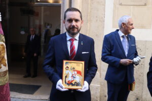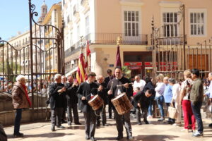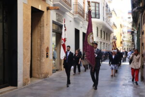 Así, este domingo, a las 11 horas se volvía a bajar, ahora desde un balcón de la sede del Colegio del Arte Mayor de la Seda, la Real Senyera que se guarda en su museo, y que es facsímil de la que se custodia en el Ayuntamiento, para ser escoltada por los actuales caballeros y damas del Centenar de la Ploma, por las calles de un centro de la ciudad abarrotado por turistas y visitantes, hasta la Catedral. Un desfile que ha transcurrido por la calle Hospital, Vinatea, Roger de Flor, Av Oeste, Adessadors, Músico Peydró, Ramillets, Tapinería, hasta la plaza de la Reina.