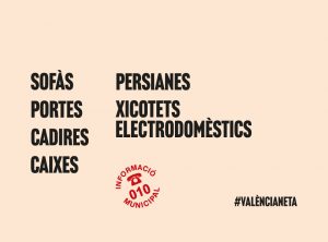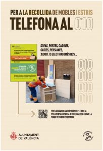 En 2020 se han recogido más de 275.500 kilos de muebles y objetos en las calles de València, de los que solo el 30% corresponden a un aviso ciudadano a través del teléfono 010, mientras que el 70% restante son enseres abandonados en la vía pública y detectados por los servicios municipales. A pesar de que la utilización del servicio gratuito de recogida de muebles y objetos puerta a puerta prácticamente se ha duplicado el año pasado respecto a 2015, el Ayuntamiento ha puesto en marcha una campaña para fomentar su uso entre el vecindario. El vicealcalde y concejal de Ecología Urbana, Sergi Campillo, ha recordado que “de todas y de todos depende que nuestra ciudad sea una ciudad limpia y que tengamos unas calles libres de muebles abandonados”.