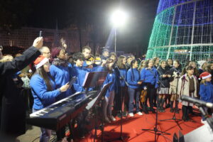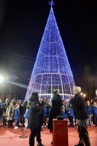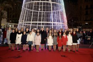 La Fallera Mayor de Valencia, Laura Mengó, y las Cortes de Honor han participado en la gélida tarde de este viernes en el acto de encendido de la iluminación de Navidad de la ciudad, celebrado en la plaza del Ayuntamiento.
