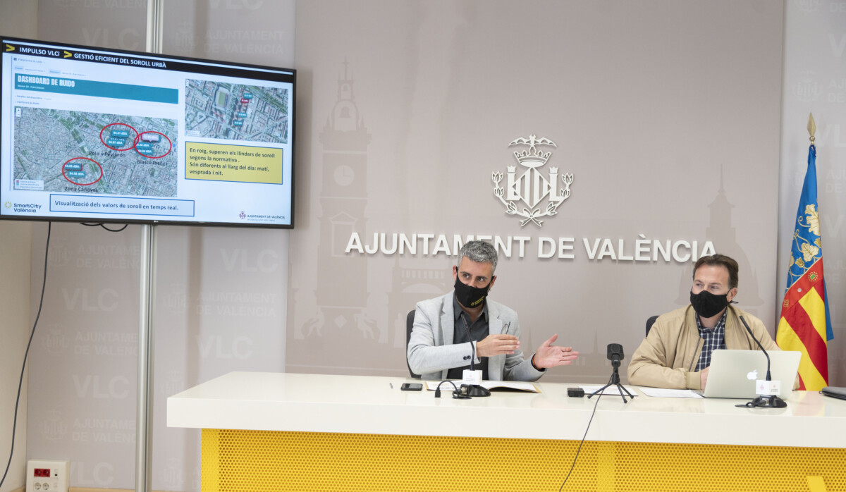El Ayuntamiento de València ha desplegado una red de dispositivos inteligentes de captación del ruido urbano por las principales zonas de ocio de la ciudad, con el objetivo de disponer de una monitorización continua de los niveles de ruido para “informar pero también influir en el ruido que se genera en cada zona”. Así lo han explicado esta mañana los concejales de Agenda Digital y Administración Electrónica, Pere Fuset, y de Movilidad Sostenible y Calidad Acústica, Giuseppe Grezzi. Se trata de una iniciativa que forma parte del programa Impulso VLCi y que va a empezar a funcionar de manera inminente.