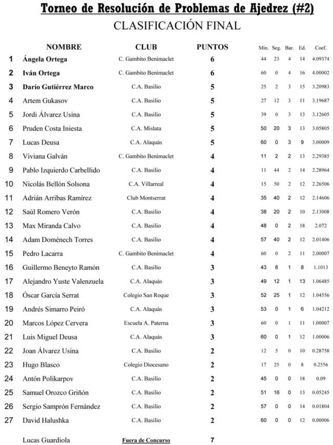 El desafío fue superado con nota por los ajedrecistas valencianos en liza, siendo la ganadora Ángela Ortega del C.A. Gambito-Benimaclet. Segundo y tercer clasificados, quedaron, respectivamente, Iván Ortega (Gambito-Benimaclet) y Darío Gutiérrez (C.A. Basilio).