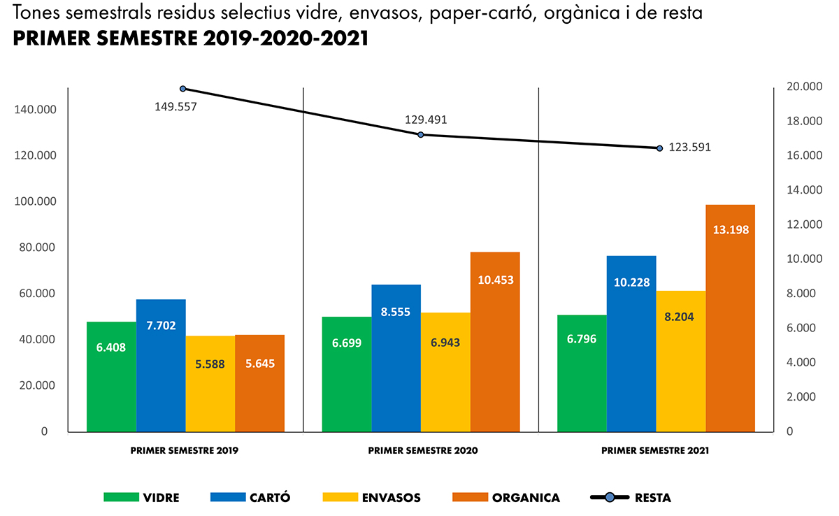 El vicealcalde y concejal de Ecología Urbana, Sergi Campillo, ha destacado “las buenas cifras” de la recogida selectiva de residuos en la ciudad. Estos resultados se explican porque, por un lado, “en general hay menos residuos” (174.900 toneladas recogidas entre enero y junio de 2019, 162.141 en 2020, y 162.017 en 2021). Ahora bien, Campillo ha subrayado que “a pesar del descenso general de los residuos, toda la selectiva sube”, a pesar de las especiales condiciones del año pasado marcadas por las restricciones derivadas del estado de alarma. La separación de residuos orgánicos es la que más ha crecido e, incluso el vidrio, que es “el elemento más estable, porque lleva muchos años, también aumenta un poco”, ha señalado el regidor.