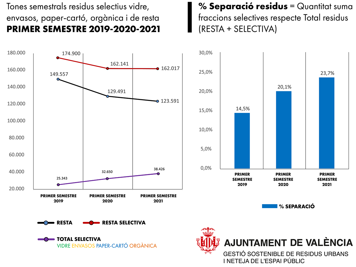 La recogida selectiva de residuos en València ha registrado una tendencia al alza en los últimos años. Así, si en el primer semestre de 2019 representaba el 14,5 % del total de residuos, un año después subía al 20,1 % en el mismo período de tiempo, y este año se sitúa en el 23,7 %. Los restos orgánicos que la población separa para favorecer su reciclaje son los que han experimentado mayor crecimiento entre los meses de enero y junio, con 13.197 toneladas en 2021, frente a las 10.452 de 2020 y las 5.645 de 2019.