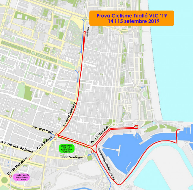 A pesar de que el grueso de las pruebas tiene lugar dentro de las instalaciones de La Marina, el Centre de Gestió de Trànsit ha alertado de la afección de la prueba de ciclismo sobre la vía pública y el transito rodado. Este circuito estará en servicio, en horario de mañanas (07:30 a 12:30h), tanto sábado 14 como domingo 15. Afectará al exterior de la Dársena del Port, a la avenida del Port hasta el cruce con Serradora, las calles Serradora, hacia el norte, y Lluís Peixó, donde se da uno giro de 180° a la altura de la calle del Conde de Melito para volver por el mismo recorrido.