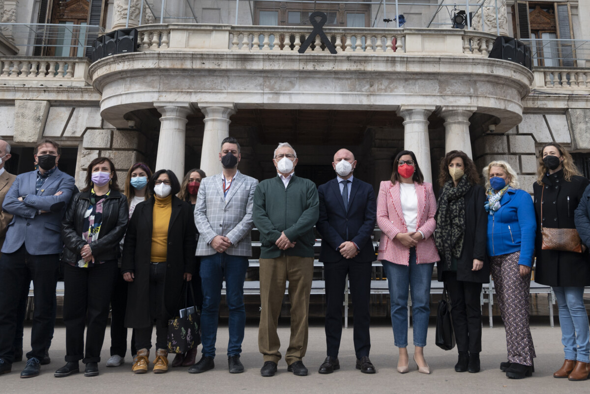 El alcalde de València, Joan Ribó, acompañado de concejales y concejalas de la corporación municipal, ha guardado este mediodía un minuto de silencio a las puertas del Ayuntamiento de València en el día europeo en memoria de las víctimas del terrorismo.