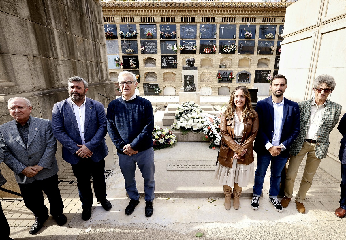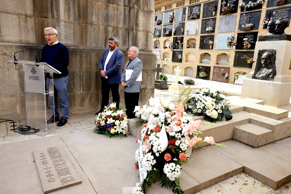 Otro de los actos que van a conmemorar el 75 aniversario del fallecimiento del escultor valenciano ha sido la entrega floral, que se ha llevado a cabo en la tumba de Mariano Benlliure del Cementerio de el Cabanyal, acto en el que ha participado el alcalde de València, acompañado por Glòria Tello y otros miembros del consistorio.