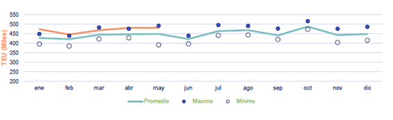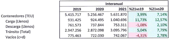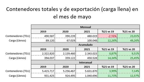 Los TEUs dedicados a exportación han crecido respecto a 2019 tanto en el mensual, como en el acumulado (enero-mayo) un 14,34% y en el interanual que lo han hecho un 11,73%. Un dato significativo de la fortaleza del sector exportador en un momento caracterizado por la carencia de contenedores disponibles vacíos y el aumento de los fletes que está produciendo que se eleven los costes para las empresas del hinterland del Puerto de València que venden sus productos a otros países, especialmente para las pequeñas y medianas empresas.