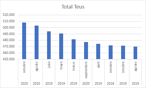 En octubre de este año hay que reflejar el crecimiento del 17,56% de contenedores llenos manipulados. En concreto, los de carga (exportaciones) aumentaron un 4,28%; los de tránsito lo hicieron en un 30,58% y los de descarga (importaciones) se contrajeron un 3,67%. En octubre se redujo un 17,77% el movimiento de contenedores vacíos.