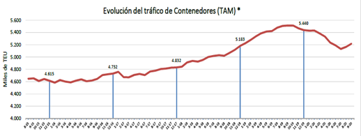El tráfico de mercancías y el movimiento de contenedores de Valenciaport han vuelto a registrar magnitudes históricas durante el mes de septiembre, con unos crecimientos frente al mismo mes del año anterior del 13,97% y del 12,20% respectivamente. En total, en este mes se han superado los 7,16 millones de toneladas de mercancías y se han movilizado 477.194 TEU (contenedores de 6,1 metros, o de 20 pies), siendo el quinto mejor mes de la historia de Valenciaport en la gestión de contenedores y el mes de septiembre con la cifra más alta de movimiento de TEUs. Este mes sigue la tendencia alcista que se inició en agosto cuando se registró el récord histórico de TEU (503.482) y ya se mostraba la recuperación de la actividad con un aumento del 7,07% en el número de contenedores y del 2,45% en mercancías.