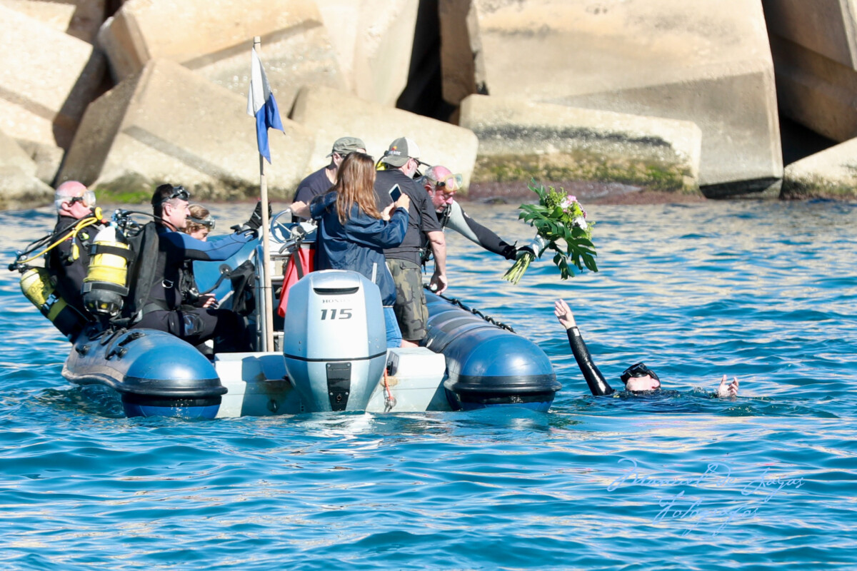 Junto a la inestimable ayuda y organización del GISED Valencia y el Real Club Náutico de Valencia, el acto estuvo presidido por el Comandante Naval de València y Castellón, D. Alfredo Cordón Scharfhausen, y el presidente de la Agrupación de Fallas del Marítimo, Julián Carabantes, que fueron los responsables de entregar a los buzos el ramo para la ofrenda. Especialmente emotivas fueron las palabras en valenciano del Comandante Naval que impresionaron a los asistentes. Tras la entrega, se cantó el Himne de la Coronació. Los máximos representantes de cada una de las comisiones agrupadas lanzaron al mar claveles en señal de ofrenda.