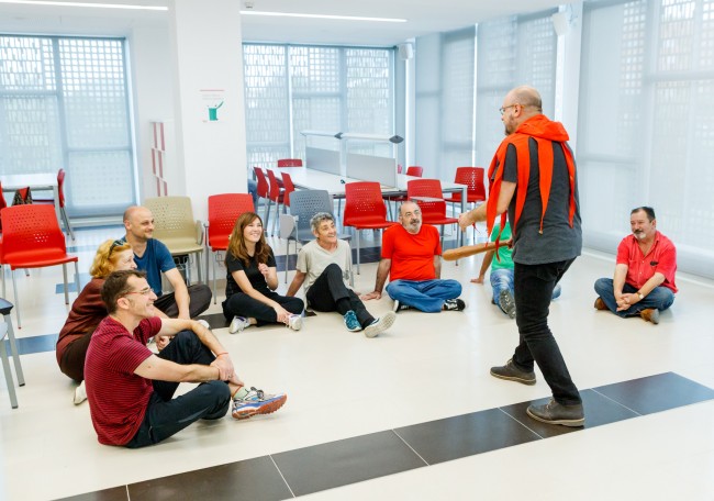 Durante toda esta semana, el popular cómico valenciano Xavi Castillo está explicando a sus alumnos en La Fábrica las claves del teatro satírico y humorístico que han popularizado a su compañía Pot de plom. Por una parte, el taller profundiza sobre la figura del bufón o el juglar, con ejercicios de teatro, de "rondalles" y cuentos populares. Y después adaptan todas esas técnicas a la actualidad, para tratarlas además desde un punto de vista satírico.
