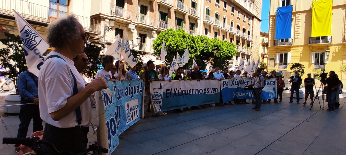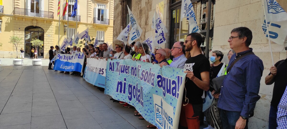 Este jueves por la mañana, representantes de distintos colectivos han participado en la concentración convocada por Xúquer Viu ante el Palau de la Generalitat por "poner de manifiesto ante la máxima institución valenciana, la fragilidad de nuestras masas de agua y la necesidad de estar vigilantes ante todas las agresiones que por intereses económicos ponen en peligro el futuro del Xúquer y l'Albufera".