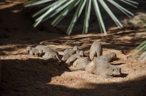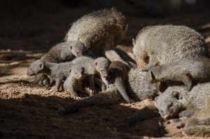 La mangosta rayada (Mungosmungo) podemos verla en la zona de la sabana, en un recinto próximo al aviario y al Kopje donde se encuentran los leones. Este añoha sido especialmente prolífico en estaespecie pues han nacido camadas en abril, junio, agosto y ahora una cuarta, convirtiéndose en uno de los grupos más numerosos de España, con más de 50 individuos. Con una organización social cooperativa, solamente 3 ó 4 hembras son reproductoras y hay un macho dominante. Las madres sincronizan sus partos para que coincidan temporalmente y se reparten la crianza, pudiendo amamantar cualquier hembra a cualquiera de las crías. Los machos subordinados ayudan a buscar comida y a cuidar de la prole. La mangosta rayada marca el territorio diariamente y todos los miembros del grupo comparten un mismo olor.